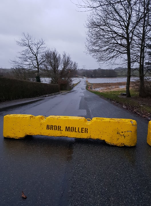 Februars store mængder regn har skabt oversvømmelser på vejene omkring Årslev Engsø. Brdr. Møller havde en travl fredag eftermiddag og aften med at spærre veje af.